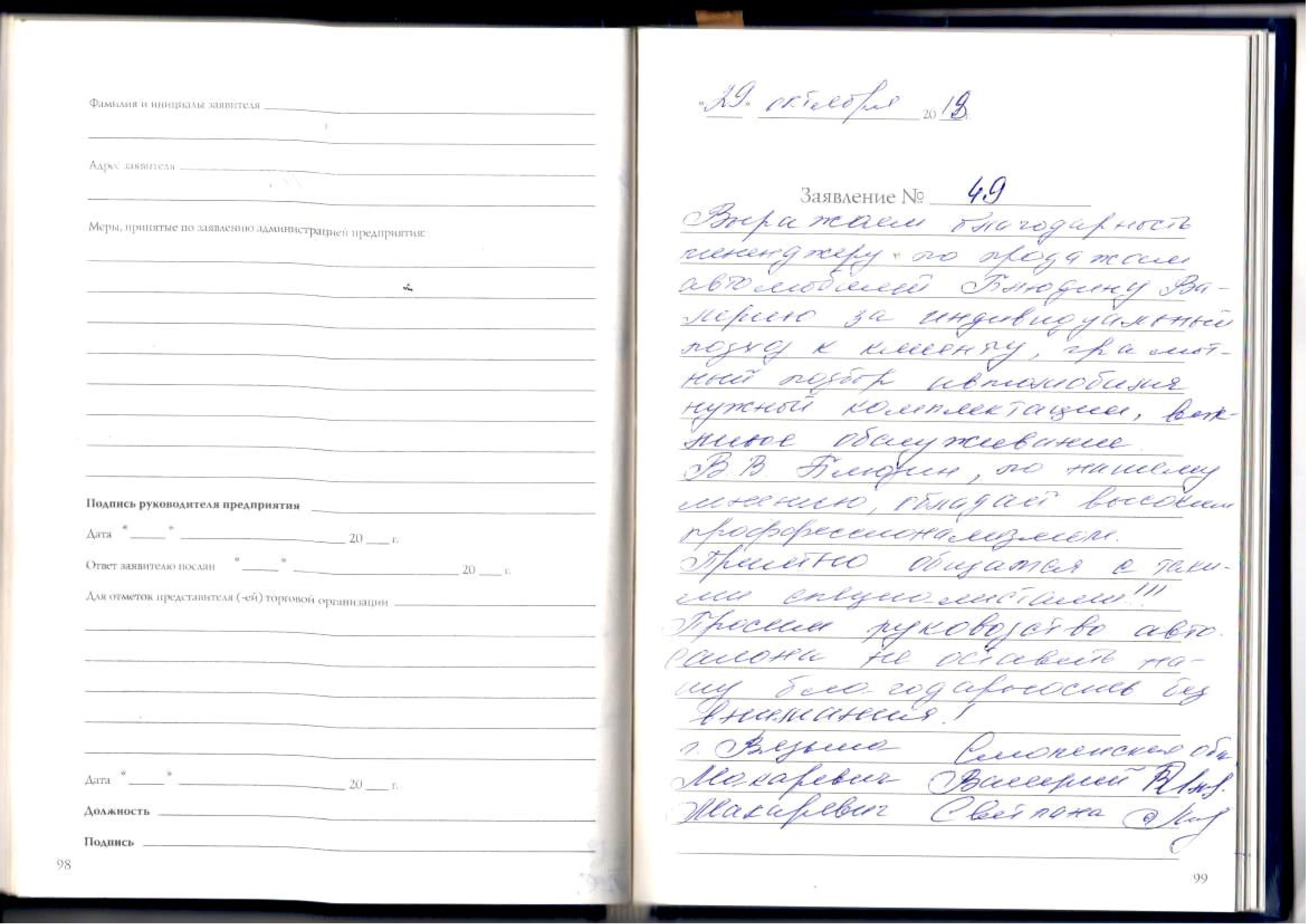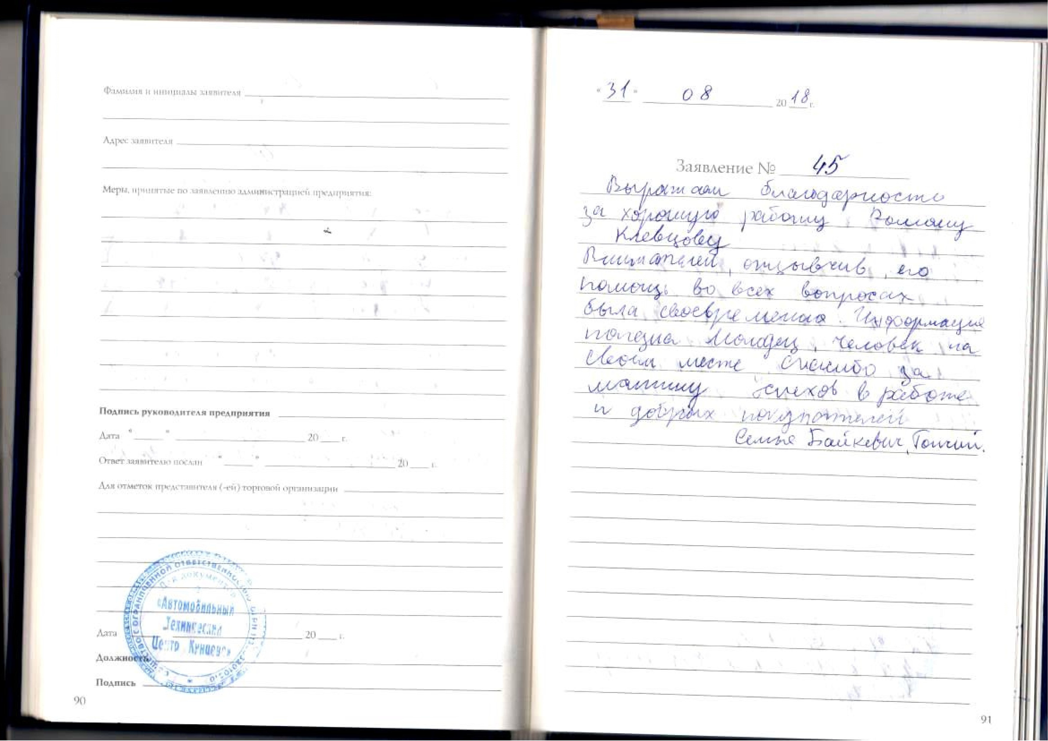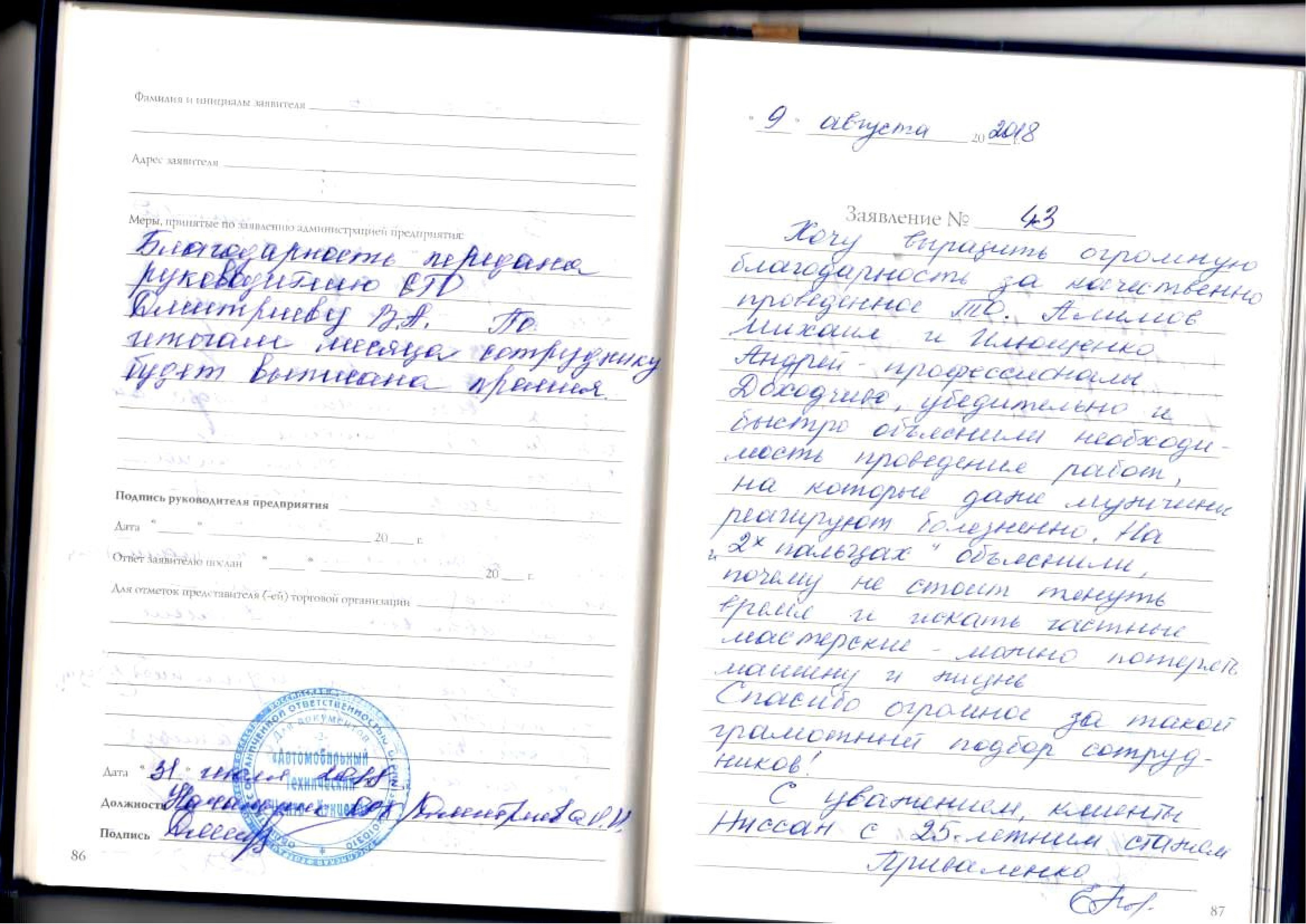 Выражаю огромную благодарность мастеру – приемщику Ильющенко Андрею Александровичу и шеф-механику Долгову Михаилу за их высочайший профессионализм: интеллект, чуткое, доброжелательное отношение к клиенту. Благодаря таким вышеперечисленным специалистам не пропадает желание обслуживаться в вашем сервисе.